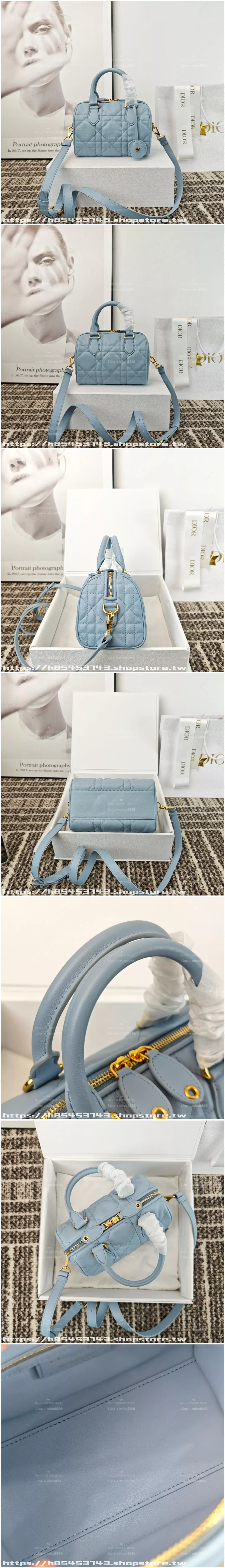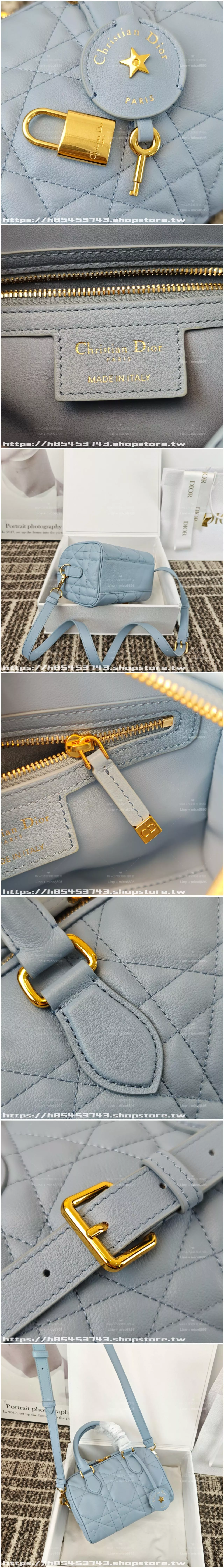 採用原版淺藍色牛皮革,搭配經典 超大藤格紋絎縫設計,展現 Dior 的精湛工藝。