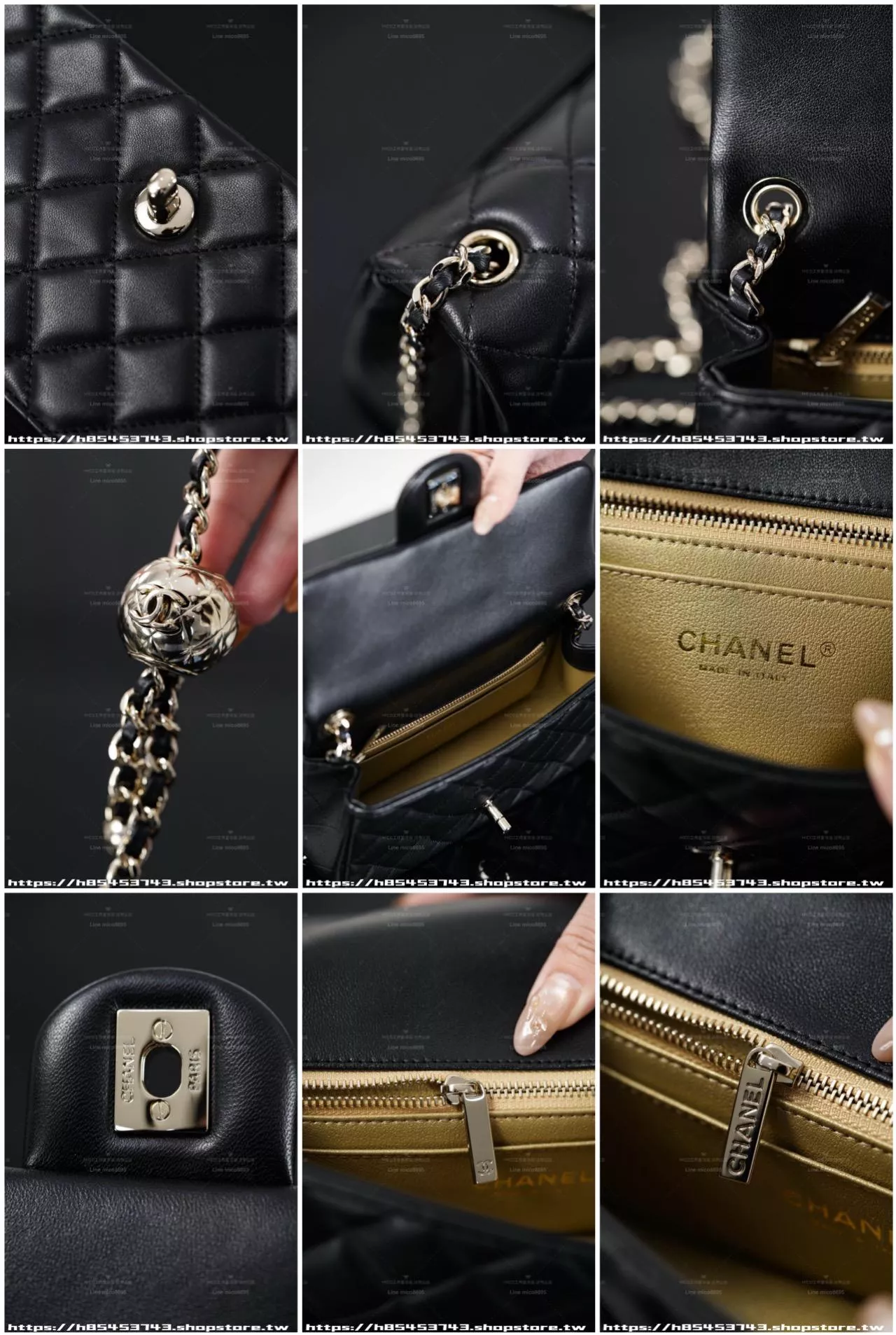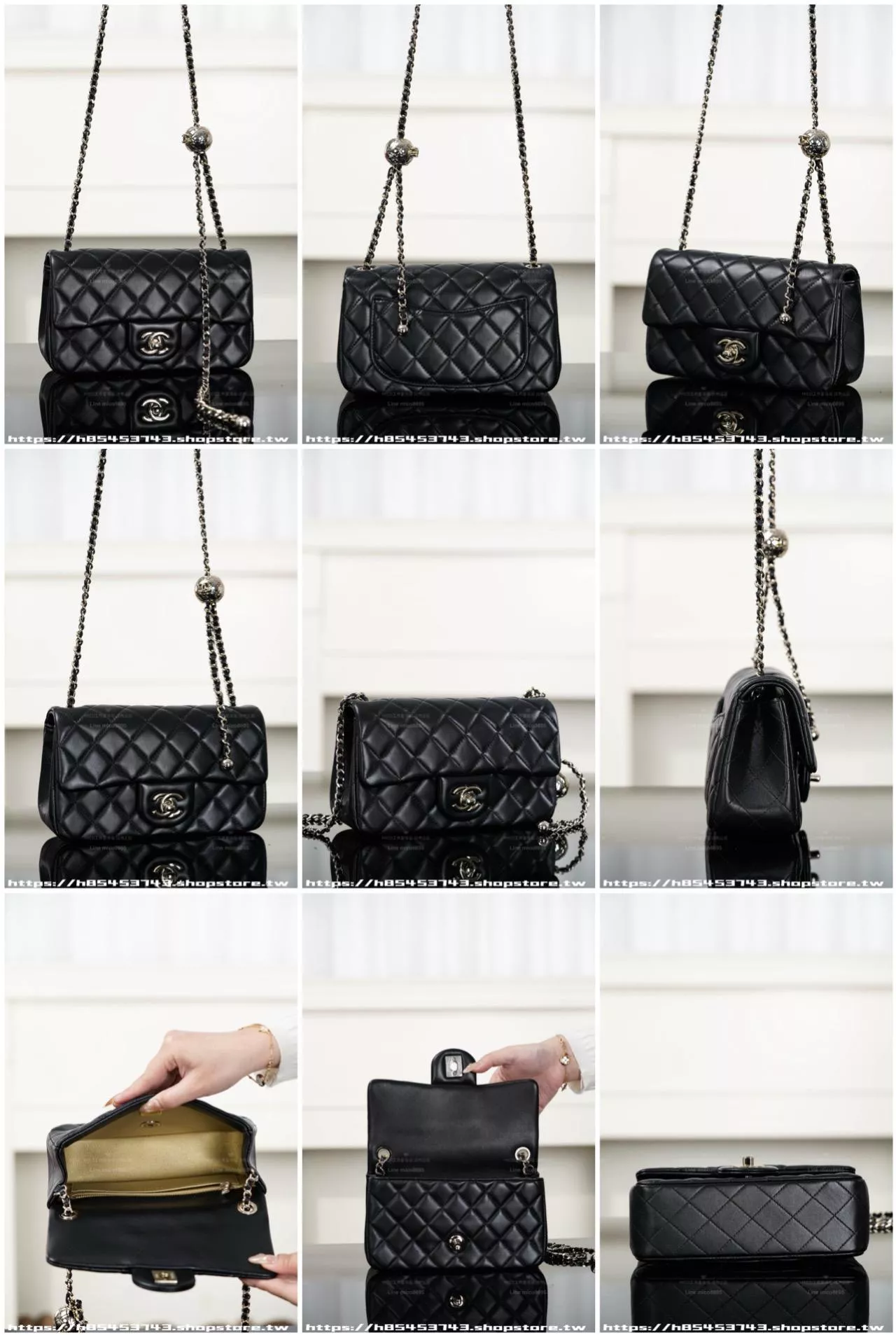 金球與鍊條為淡香檳金色調,與包身黑色形成柔和對比,不張揚卻極具質感。