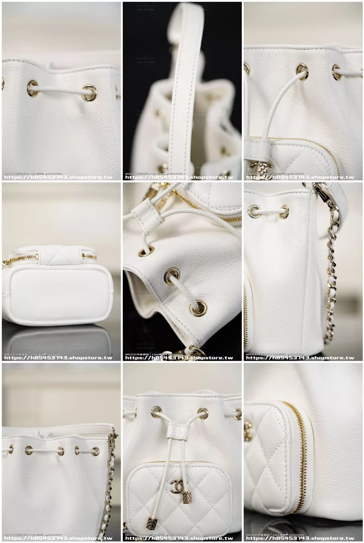 25B mini鏈條抽繩小水桶包 福袋包 白色/魚子醬牛皮(12.5×10×7.5cm)