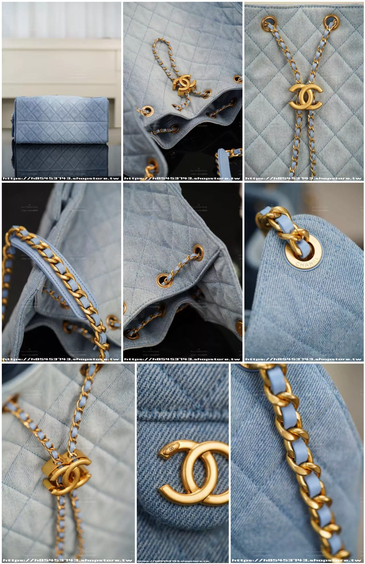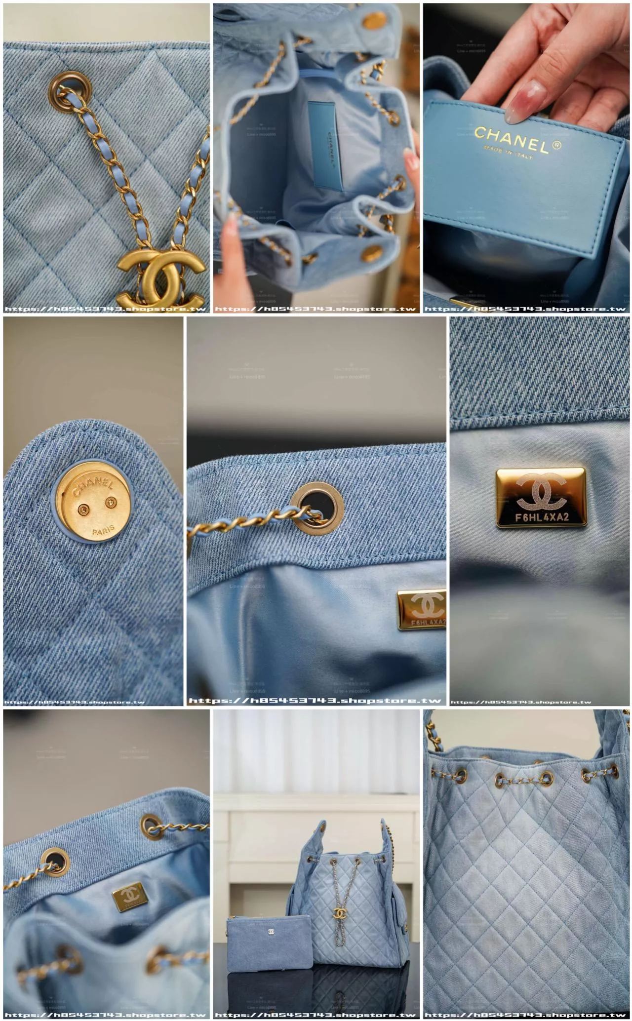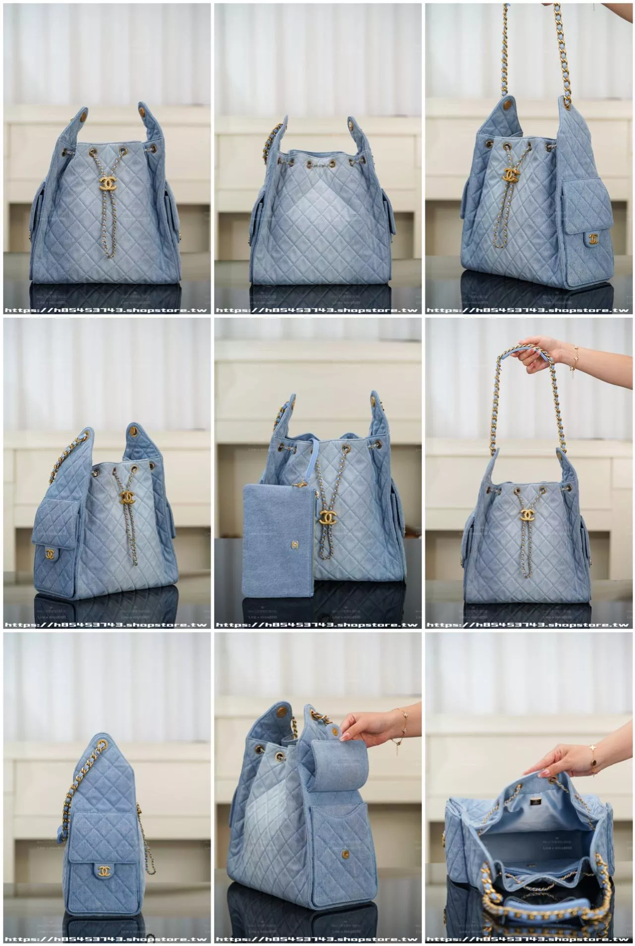 CHANEL 25c 大號 25Bag 淺牛仔金釦水桶包/抽繩肩背包 30cm