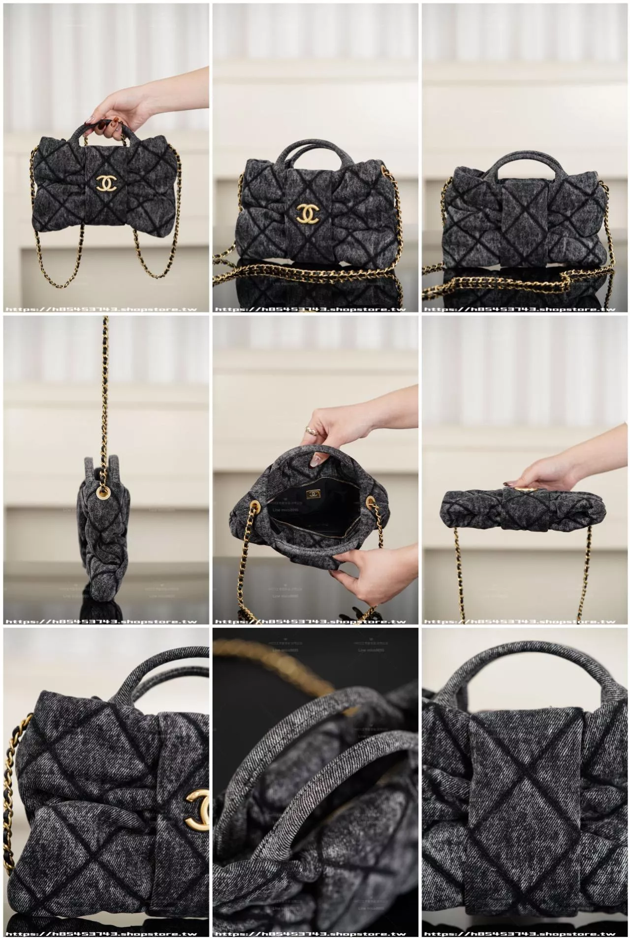 25K 蝴蝶結菱格手袋|黑色丹寧牛仔・小號・砂金雙C