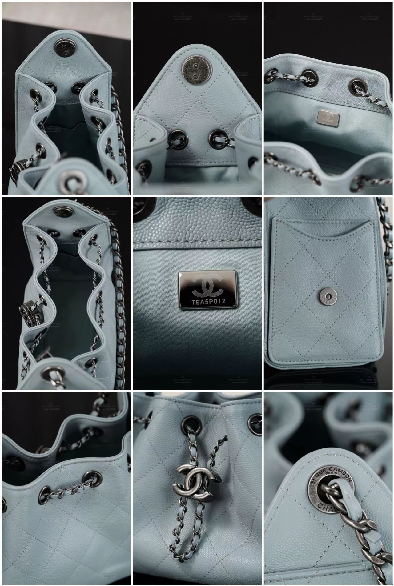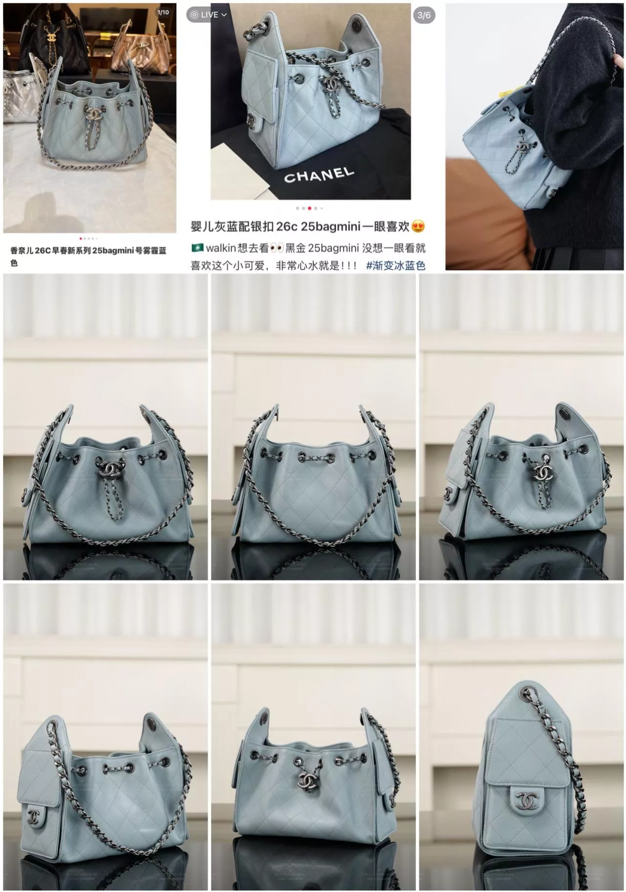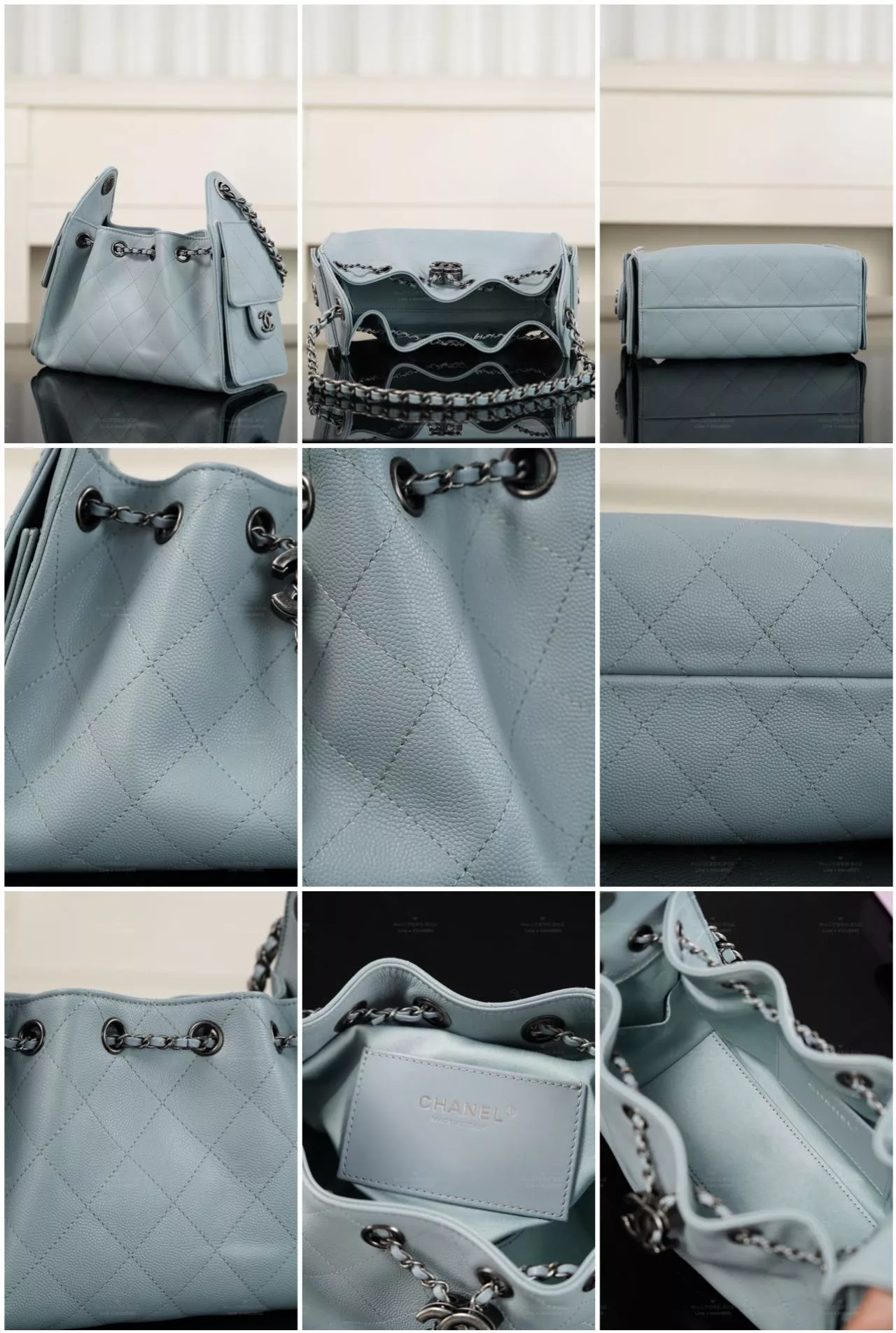 26C 系列推出的 25 Bag Mini,以 天藍色魚子醬牛皮 搭配 古銀色做舊五金,